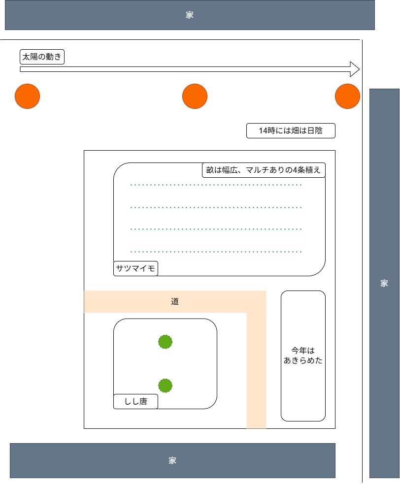 畝は幅広、マルチは一応したけど、サツマイモは青点で表した箇所。なんと4条植え。